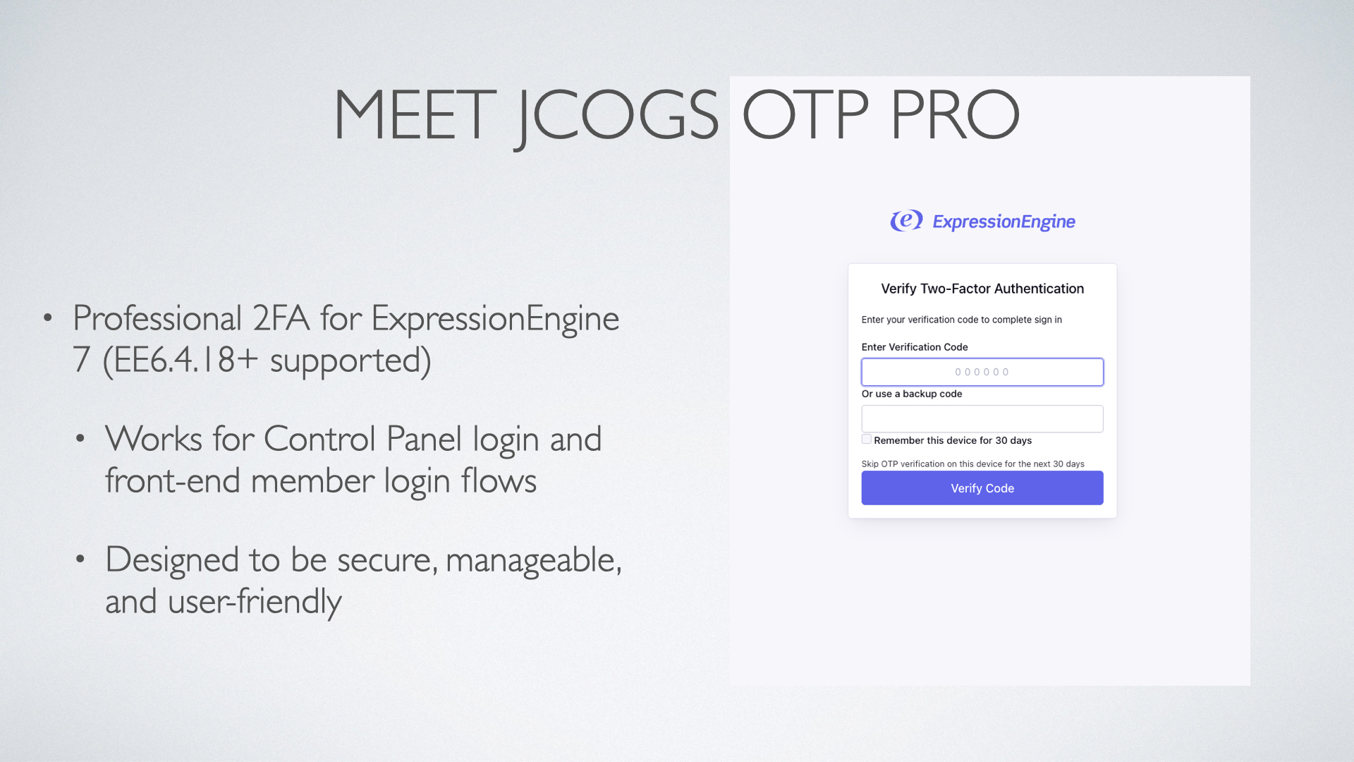 JCOGS OTP Pro is designed for modern ExpressionEngine installations: