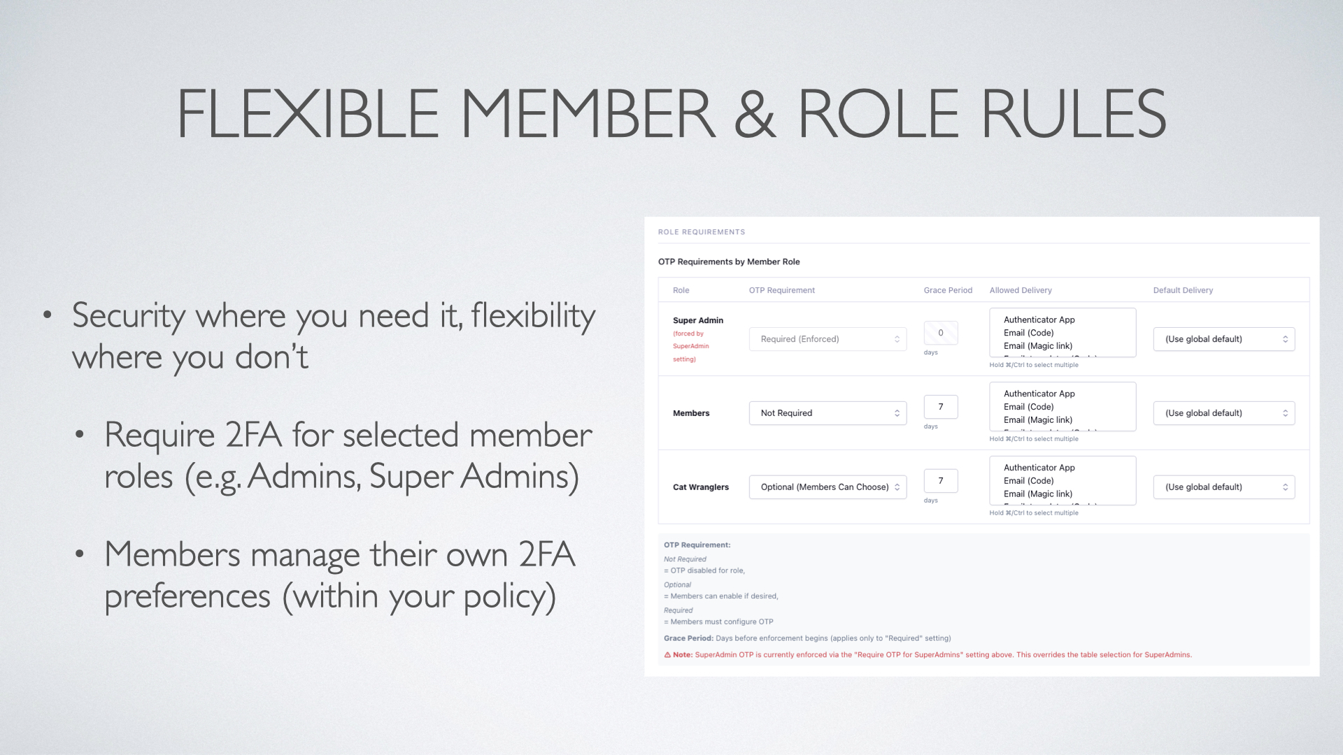 Define which roles are required to use OTP, which roles can opt in, and how enforcement and grace periods apply. This lets you roll out MFA gradually or target only high-risk roles.