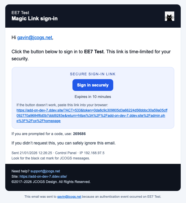 JCOGS OTP Pro Magic Links is a companion add-on for ExpressionEngine (EE 6.4.18+ and 7+) that adds a “click-to-verify” sign-in option to JCOGS OTP Pro. Instead of typing a one-time code, members receive a secure, time-limited link by email—making MFA feel effortless while still adding a strong second step to authentication.