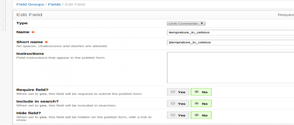 Overview: This is simple field type which works on the basic definition of Unit Converter “Conversion of units is the conversion between different units of measurement for the same quantity, typically through multiplicative conversion factors”. So the different units of measurement for the same quality can be set from the custom field’s setting. You can understand the functioning of this field type with this example. Let you would like to create a field for temperature and would like to populate the template in units like Celsius (C), Fahrenheit (F) and Kelvin (K). To achieve it, you either create 3 fields for all 3 units or create 1 field for a unit and put some mathematical calculation within the template to show the temperature in different units. The addon has been upgraded for the EE 3.0, EE 3.0.1, EE3.0.2 versions. Installation: The download contains EE3 version. ExpressionEngine 3.+ • Download and unzip unit converter • Copy the system/user/addons/unit_convertor folder to your system/user/addons/unit_convertor directory • Copy the system/user/language/english/ folder to your Copy the system/user/language/english/ directory • In your Control Panel, go to Add-Ons Manager and click the Install-link in the unit convertor.