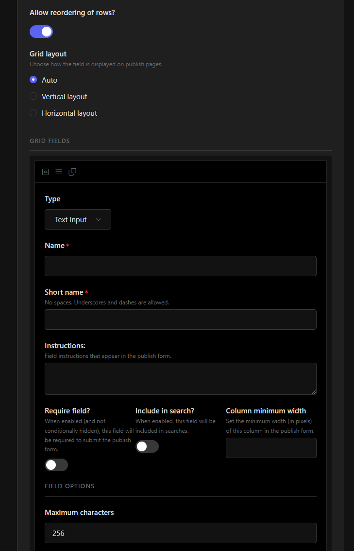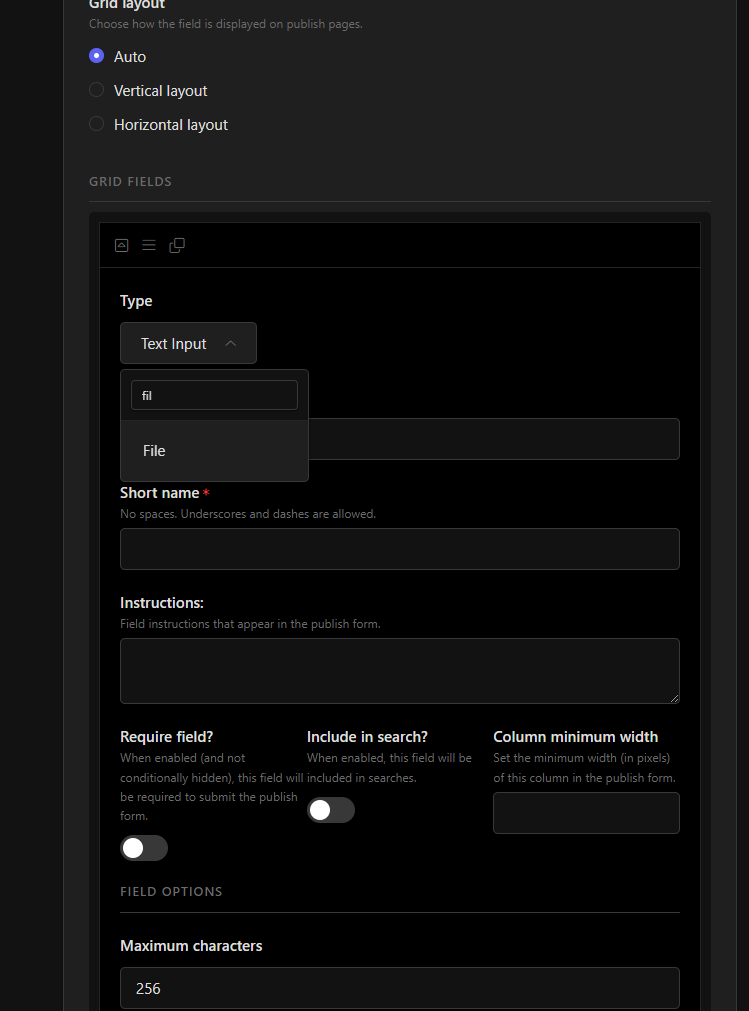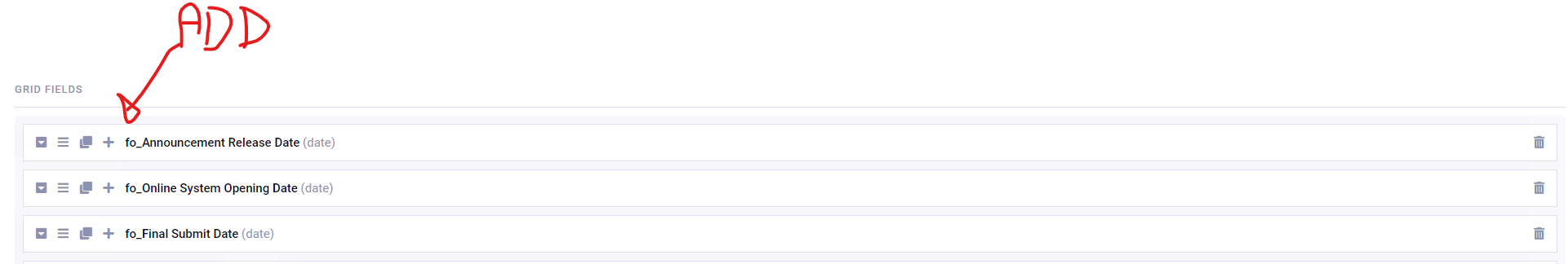 Here is the issue: On grid field, when adding the fields, there is no add button after you add the first one. Whatever field is select, you are stuck with those that the same type. There is no add button. Only has a clone/copy.