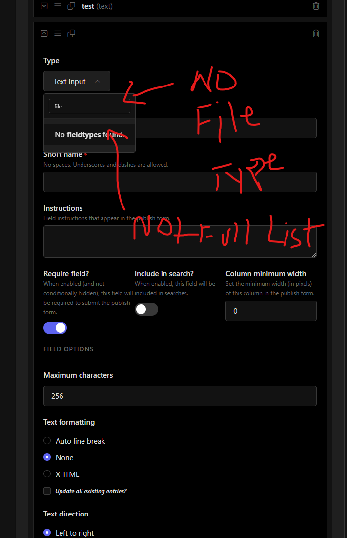 Ex: If input field is selected first, you are stuck with input fields. You will not be able to select a file field as an example (see pics). There is no add new field button like EE6. (see pic)