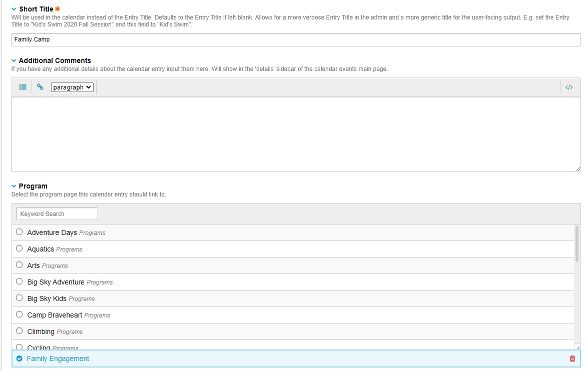 I have a channel called {calendar_events} in which there are several fields, including {short_title}, {additional_comments} and a relationship field called {program}