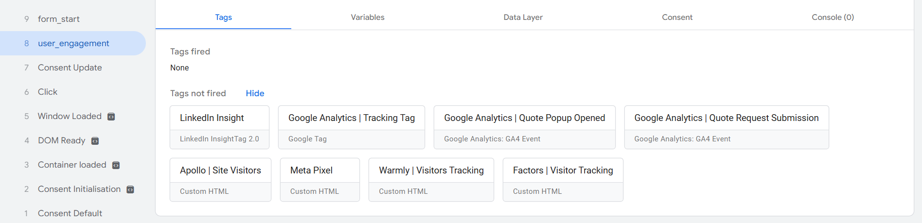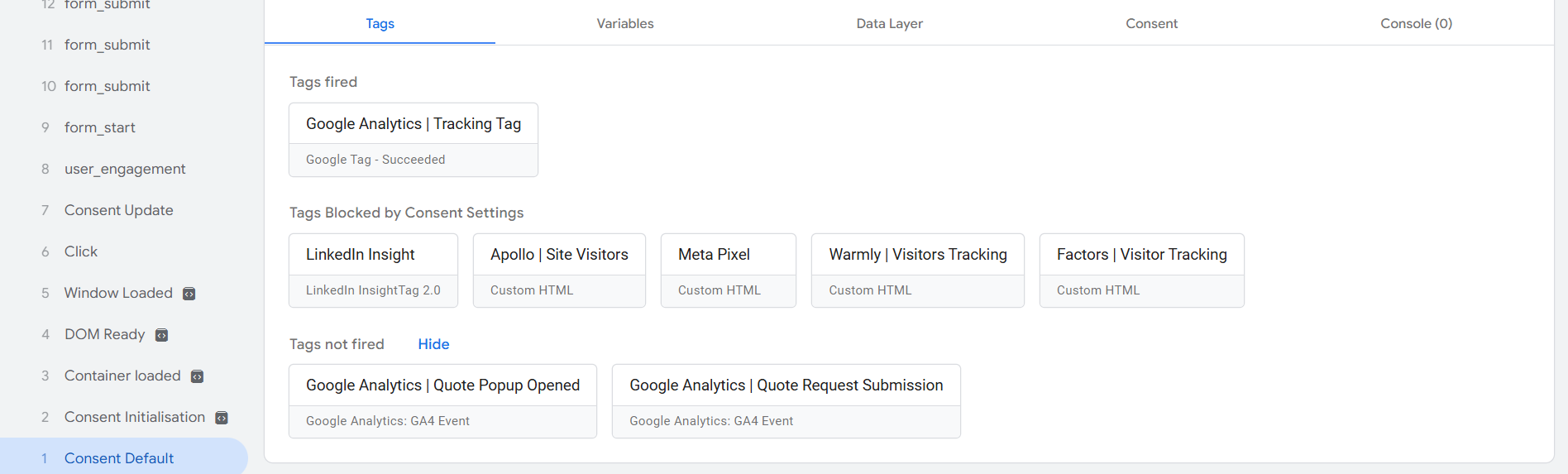 Looks like I successfully integrated the EE consent module with Google Consent Mode, however not all tags are firing in Google Tag Manager. Its probably some setting in GTM console itself. However, I wanted to check with you fine folk and see how you set this up…. Maybe I could get some better ideas on how to accomplish this for future websites and improve this one. I don’t want to use any consent management platforms.