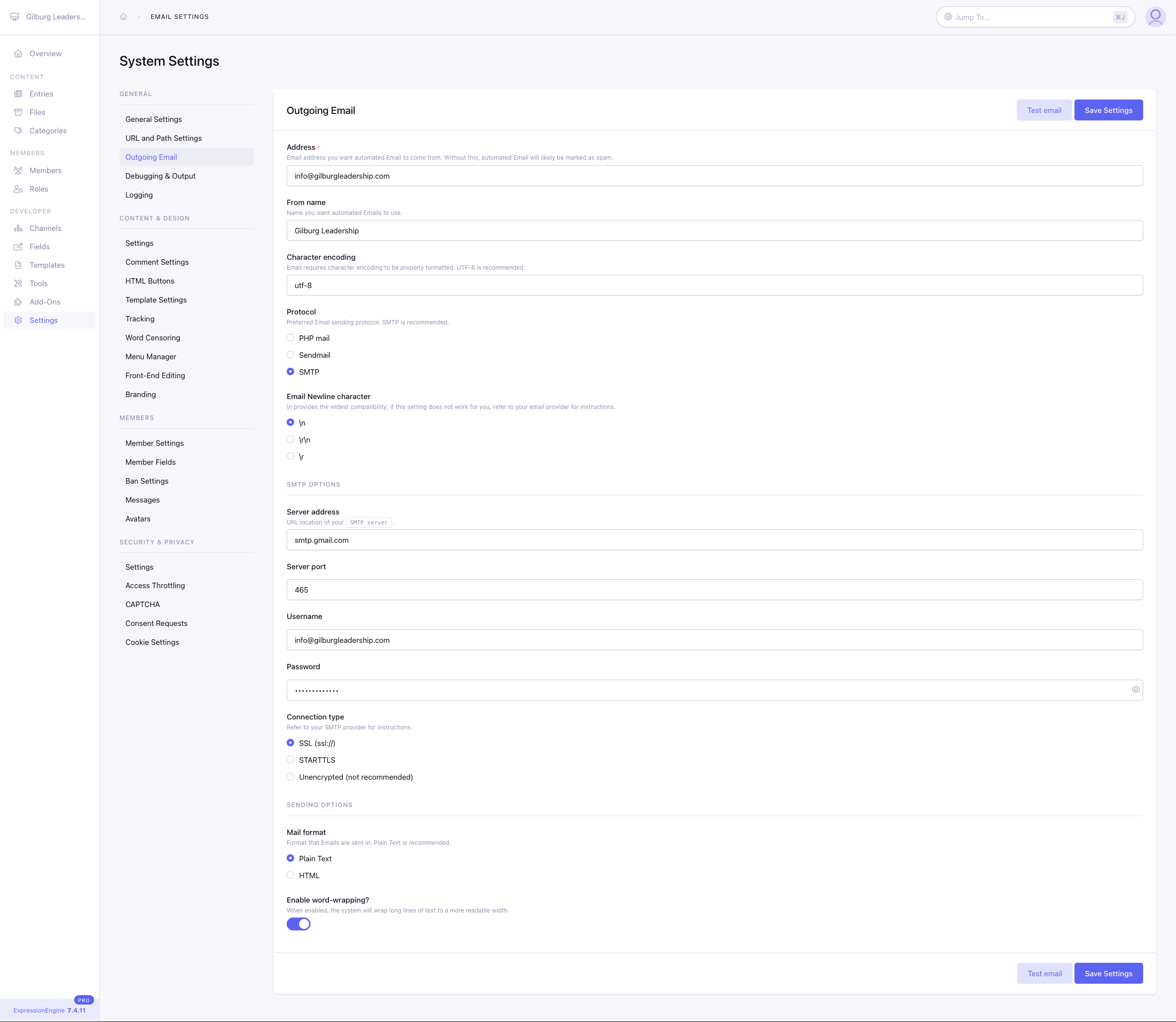 When testing the Google SMTP settings that we have configured following the steps here: https://u.expressionengine.com/article/using-gmail-smtp-to-send-emails-from-your-website it keeps failing saying cannot send test email at this time.