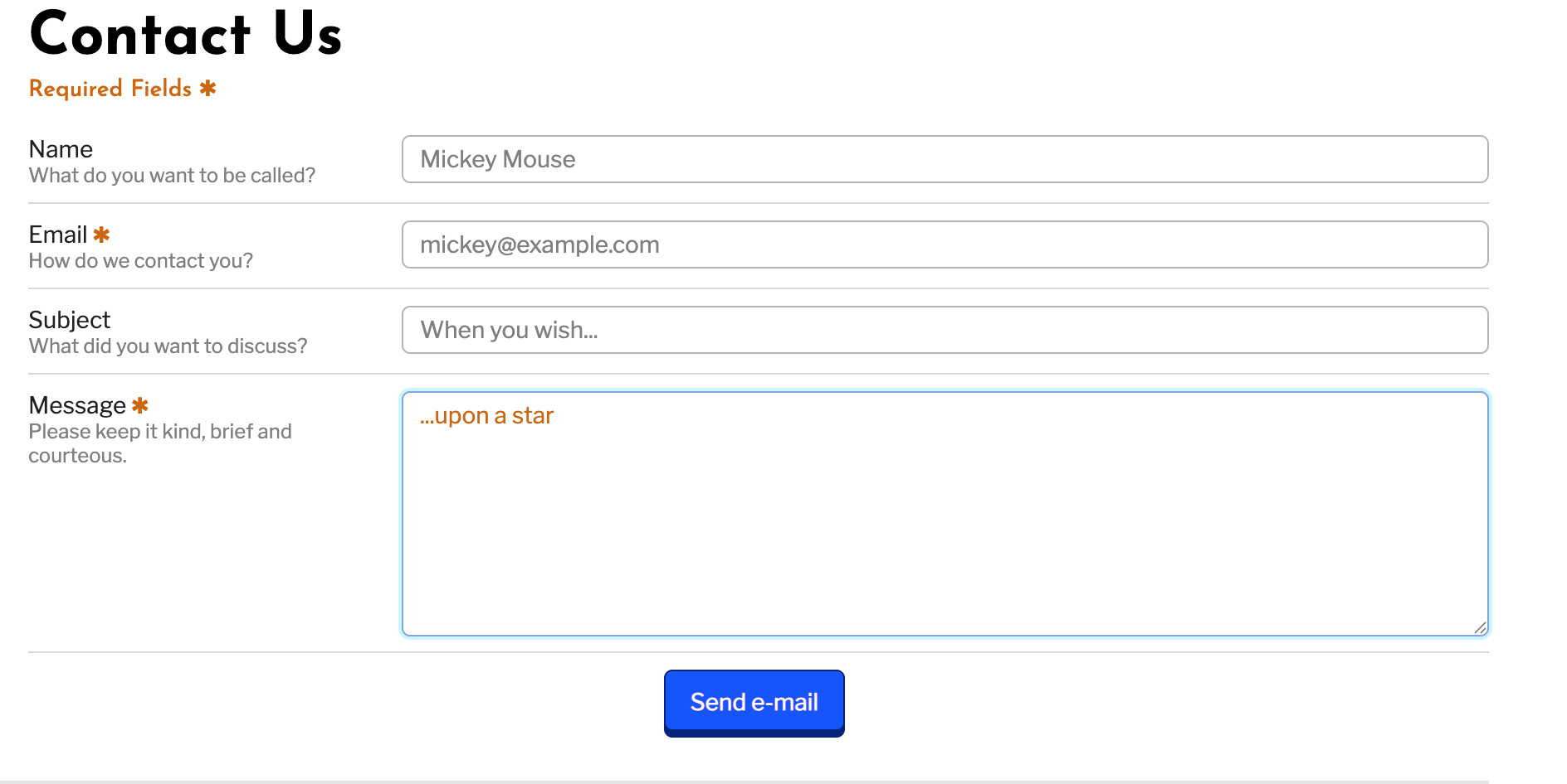 </section>The input field for ‘Name,’ <input name=”message[]” type=”text” value=”“> specifies the message[] array, so the name ‘Mickey Mouse’ gets appended to the body of the message along with the conventional message that is sent.